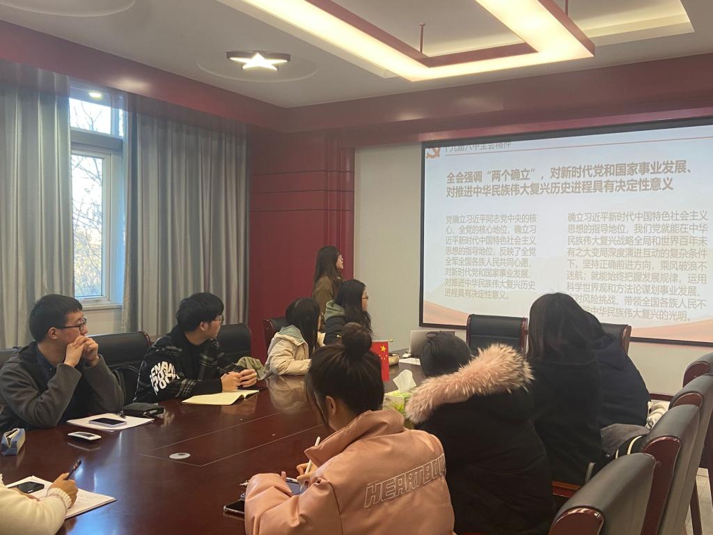 党委副书记袁怡琨老师分享了自己学党史的感悟,讲解了红军、八路军、新四军不同称谓的历史渊源,鼓励同学们将党史学习习惯化、终生化。她也结合时事分享了自己学习领会《决议》的心得,希望同学们努力做到在复杂的网络舆论环境下保持理性思考,不盲目跟风,透过事件看到背后的真相和本质。作为党员学生,更要勇敢有力地坚守思想舆论的红色地带、争取灰色地带、亮剑黑色地带。