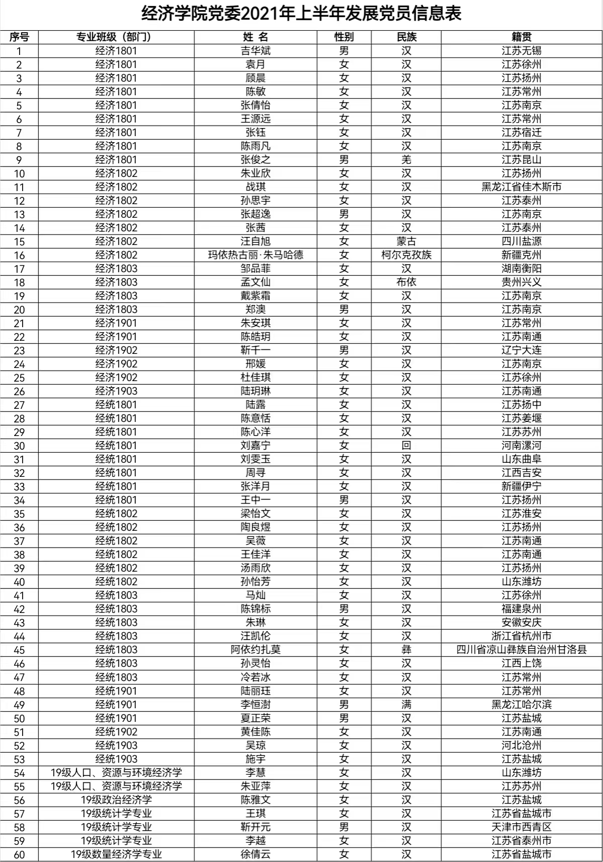 根据《发展党员工作实施细则》有关规定,经学院基层党支部考察、学院党委预审,拟接收吉华斌等60名同志为中共预备党员。现将名单予以公示: