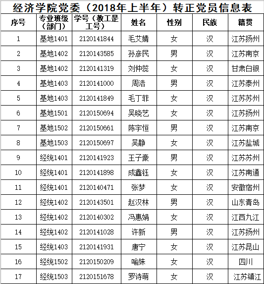 在听取党小组和党员、群众意见的基础上,经支部委员会审查同意,近期将召开支部大会,拟同意毛艾婧等17名同志转为中共正式党员。根据发展党员工作有关要求,现将其有关情况公示如下: