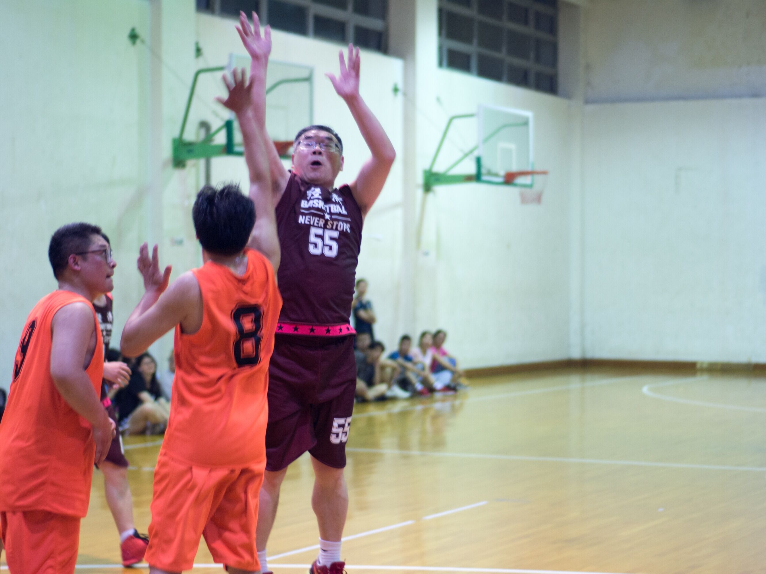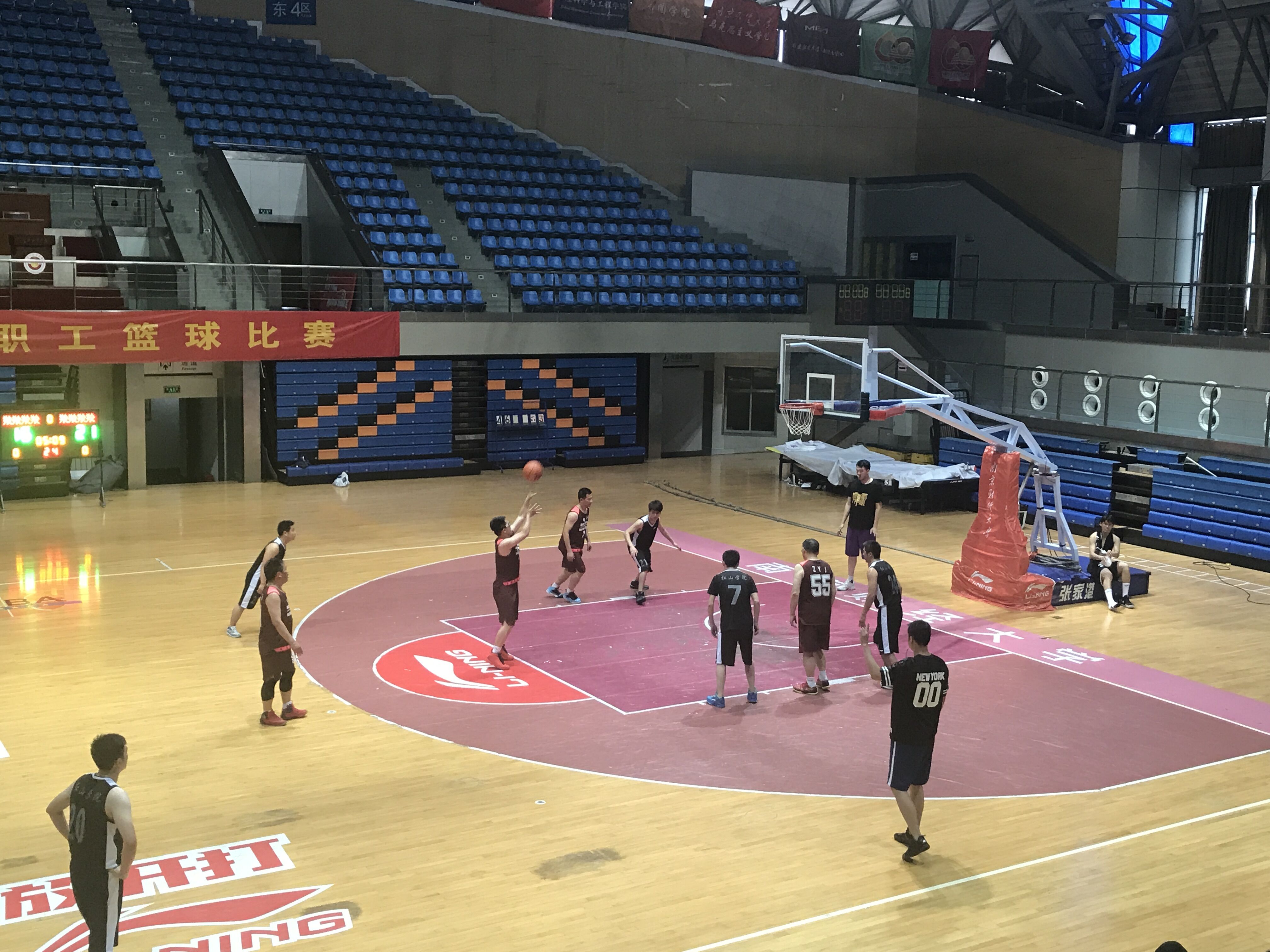 5月19日晚,体育馆主馆内热闹非凡,呼声不断,经济联队和机关队之间的教职工篮球比赛季军之争在此激烈展开。