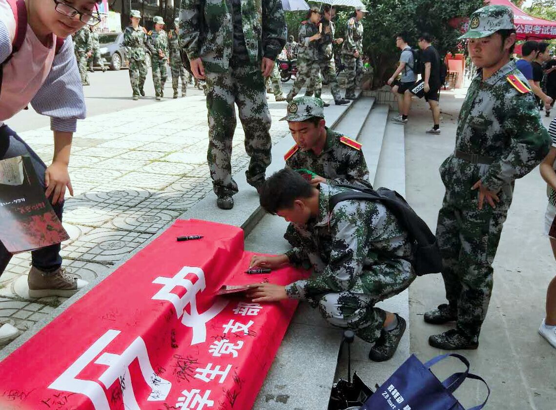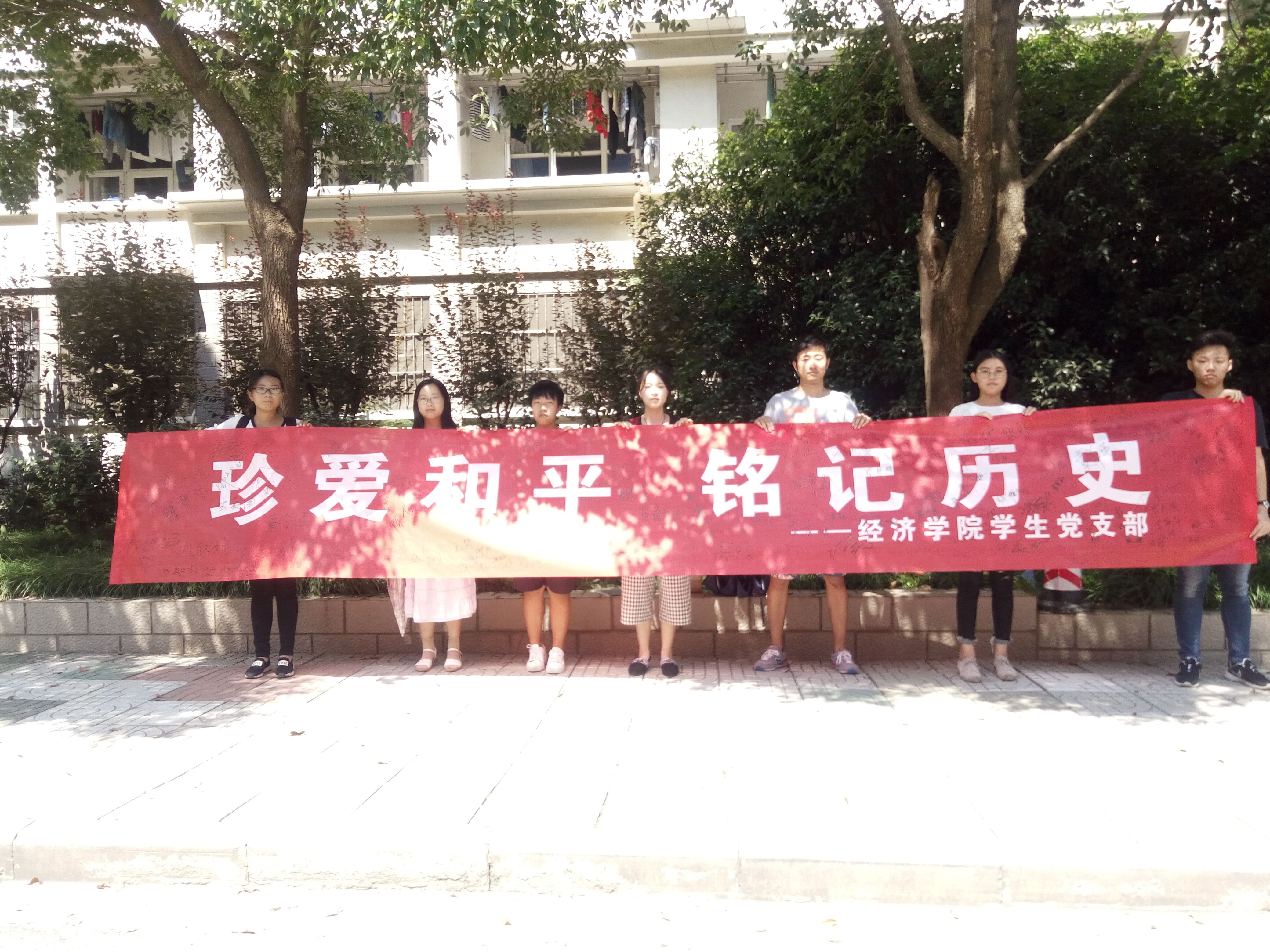 入党积极分子及学生党员们将印有“珍爱和平 铭记历史”标语的条幅中苑食堂广场处展开,随即引来许多师生驻足签名。师生们纷纷在横幅上肃穆而郑重地签上了自己的名字,表达自己对历史事实的铭记,对和平生活的珍爱。一名刚刚结束军训的陈姓同学签完名后庄重表示:“作为中国人,我将永远记得九一八事变,不忘国耻。作为一名当代大学生,我将为中华之崛起而读书”。