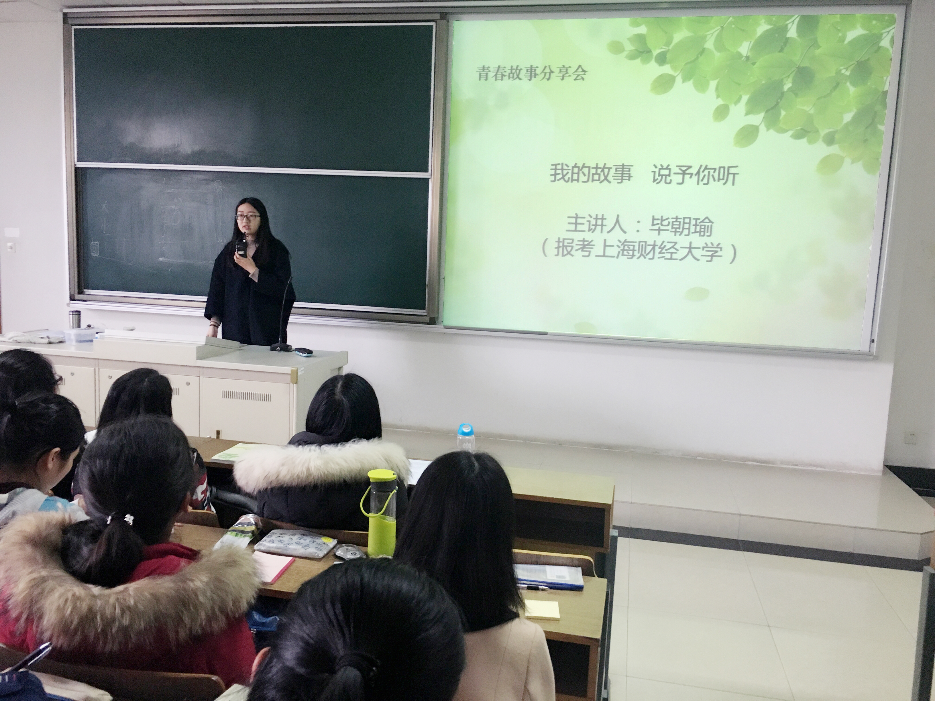今年考取厦门大学的吴文妍和上海财经大学的毕朝瑜同学分享了各自大学四年的成长经历和考研心得,同时勉励在场学生一定要多读书、读好书,积极参加各项有益的第二课堂活动,科学合理地进行大学生涯规划,提升能力,充实自己,完满度过大学生活。
