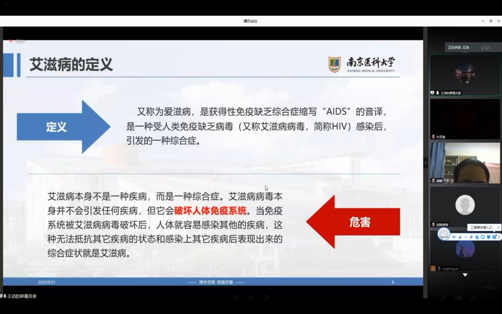 学生作题为“为艾发声,与爱同行”艾滋病预防科普讲座。讲座由南京医科大学第一附属医院(江苏省人民医院)内分泌科护士长,医学硕士,副主任护师徐晶晶老师指导,宣讲团成员王洁担任主讲,全校共370多名同学在线聆听。