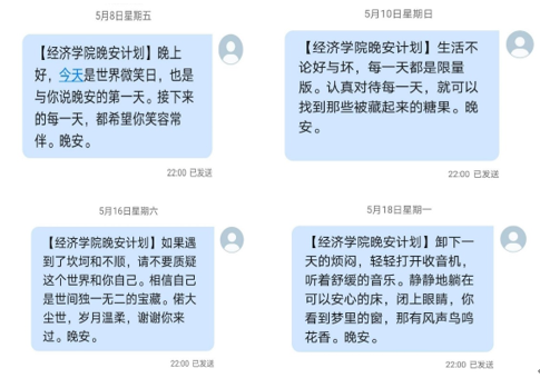 经济1801班的王同学说,每天晚上准时收看晚安短信,温暖的文字传达着关爱与鼓励,心理觉得很温暖也很放松;经统1901的陆同学说,每天甚至很期待收到晚安短信的时刻,尽管现在居家学习,与同学们彼此相隔很远,但是晚安短信的活动会拉进彼此的距离。经济19级的李同学说,晚安短信活动让他养成了良好的作息习惯。自己原本有熬夜的习惯,但是每晚22点晚安短信如期而至,群里同学们互道晚安,促使自己也该早点休息了。