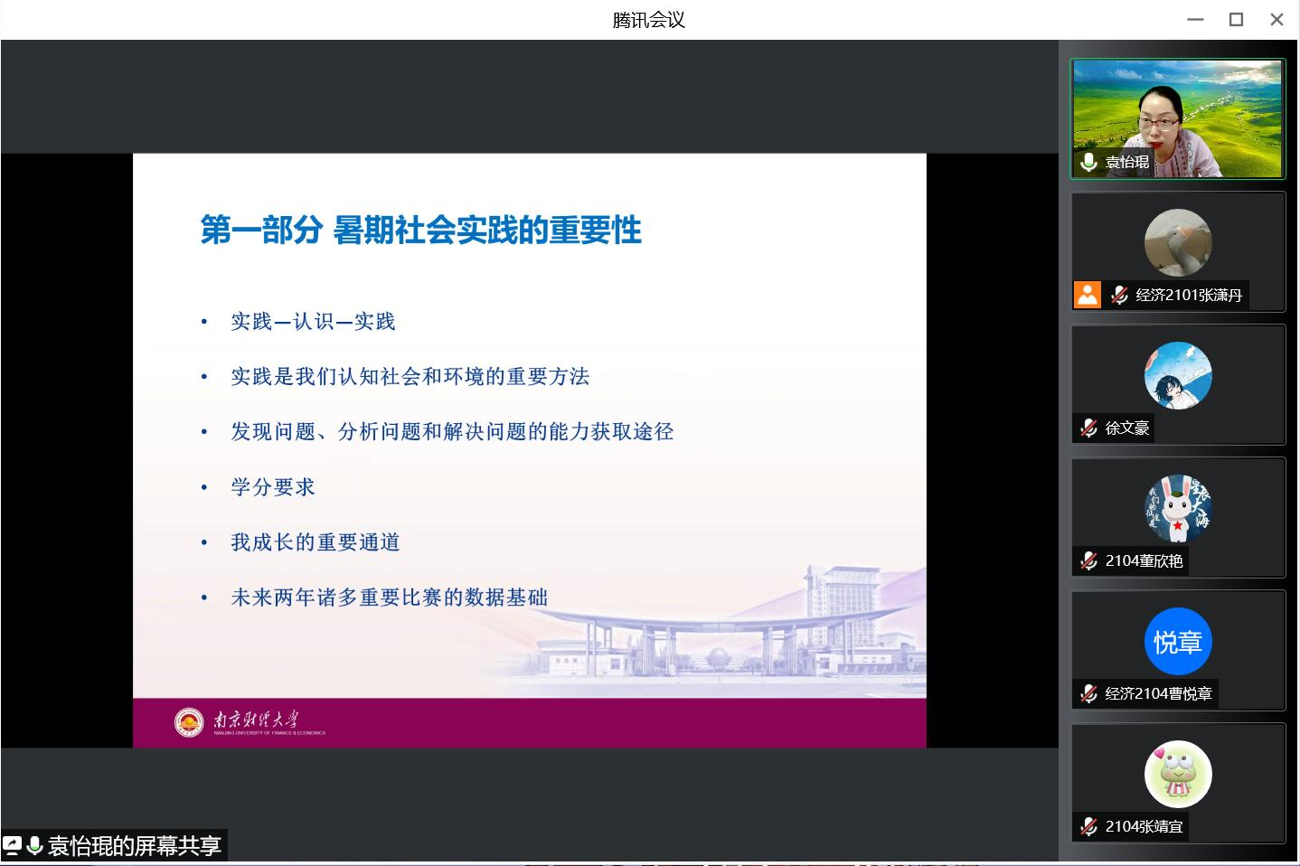 辅导员梁少颖老师对暑期社会实践注意事项进行了强调,提醒同学们注意疫情防控及自身安全,鼓励同学参与团队实践参加并积极投稿。最后的自由提问环节,同学们踊跃提问,两位老师进行了耐心、细致的解答。