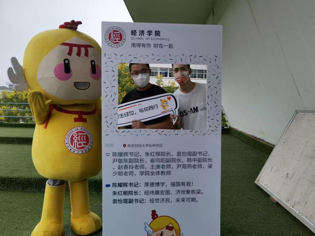 对每个新生的美好祝愿,希望每一个留下自己印记的新生都能度过美好的四年时光,不负年华,学业有成。初来乍到,新生难免有些羞涩,但对经院吉祥物小经灵发出的合影邀请,却没有人会摇头拒绝。在打卡框下,是成人色情
