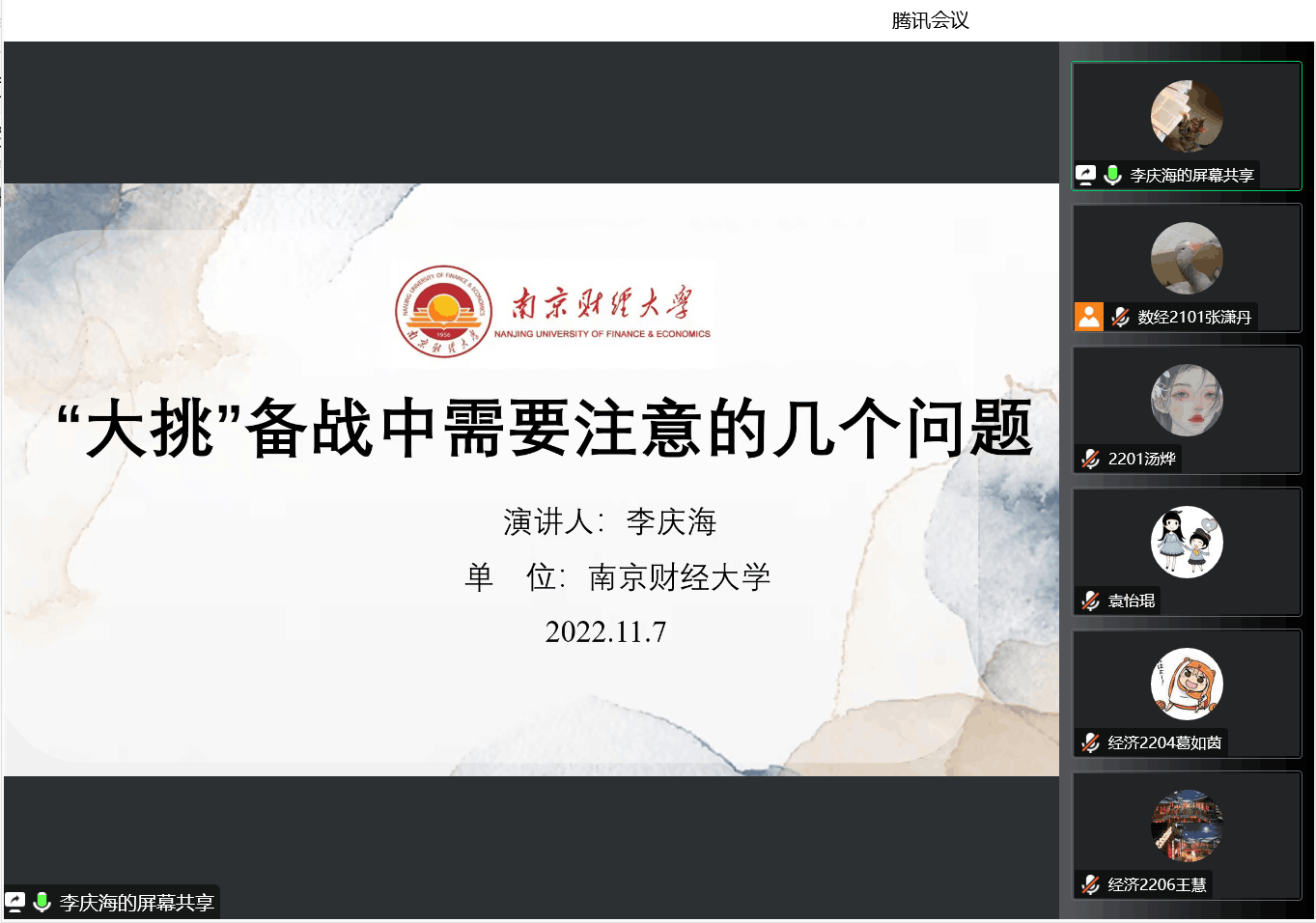 “挑战杯”全国大学生课外学术科技作品竞赛(简称“大挑”)动员及经验分享会。学院党委副书记袁怡琨老师,统计系副主任、副教授李庆海老师出席会议,数经2001班纪齐和桑海瑞同学作行经验分享,学院各年级同学参加此次动员会。