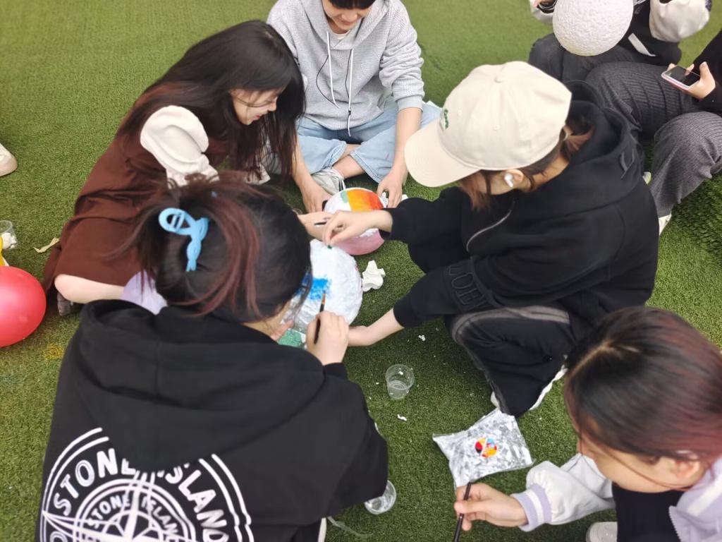 在轻松愉快的氛围中,志愿者们坐在草坪上,伴随着春日徐徐的微风,开始了纸浆气球的制作。用纸浆包裹气球的这个环节,耗时长、难度大,但同学们耐心十足,为气球穿上了细腻的“纸衣裳”。接着,同学们还纷纷拿起画笔,在气球上出对未来和自然的真挚期许和美好祝愿。有的以国旗为创作模板,在红色的气球上点缀上金黄色的五角星;有的以青山绿水为愿景,将山清水秀的画面呈现于气球之上……大家用各式各样的图案设计与鲜艳的色彩碰撞,展现出一幅幅美丽画卷。