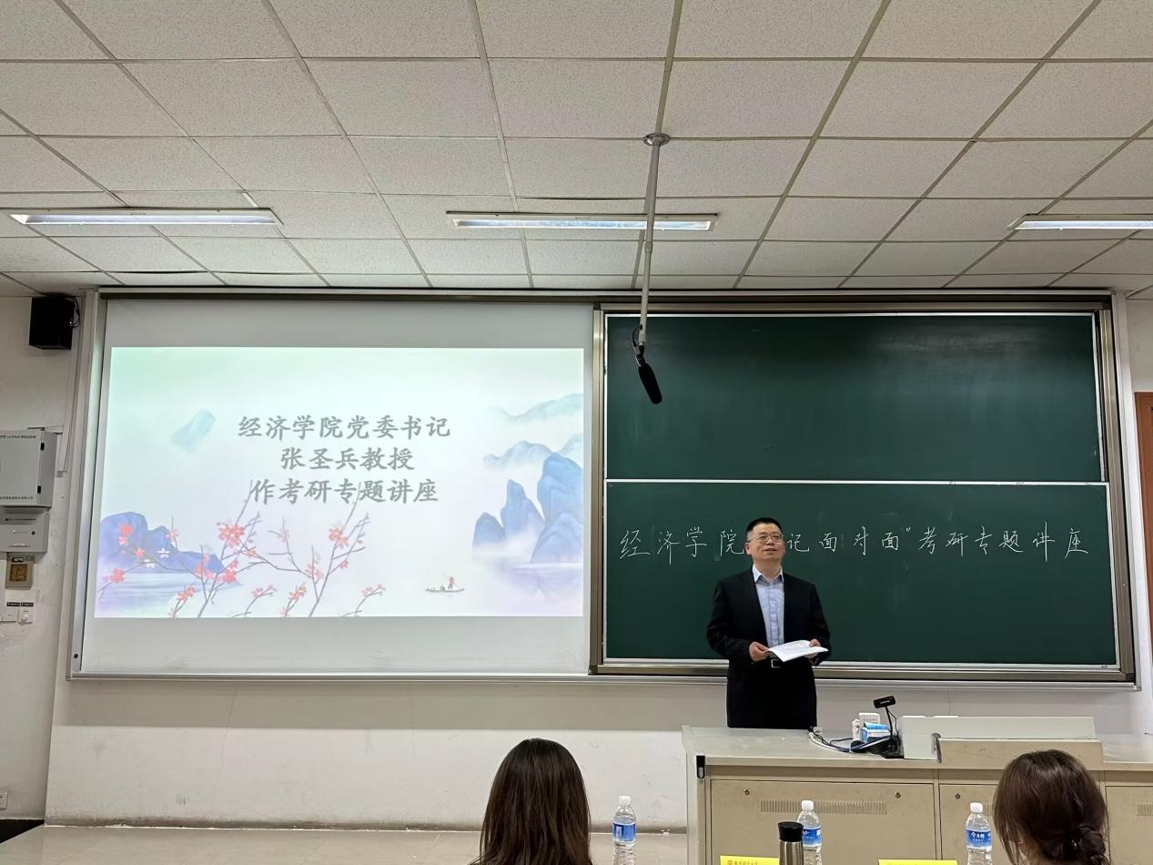 随后,党委书记张圣兵教授从考研选择、复习备考、就业择业等方面作考研专题分享。他结合自身经历,讲述了自己从北京师范大学政治经济学本科毕业后投身工作,而后又到北京大学成人色情