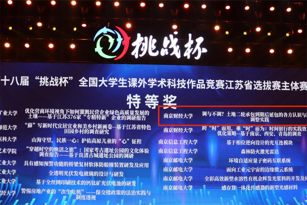 选送的参赛作品《调与不调?土地二轮承包到期后延包的各方认识与地方调整实践》荣获江苏省特等奖并入围全国决赛,参赛作品《“数”丰年:数字乡村“智”理致力共同富裕进行时——基于苏浙皖国家级数字乡村试点的田野调查》荣获江苏省一等奖。