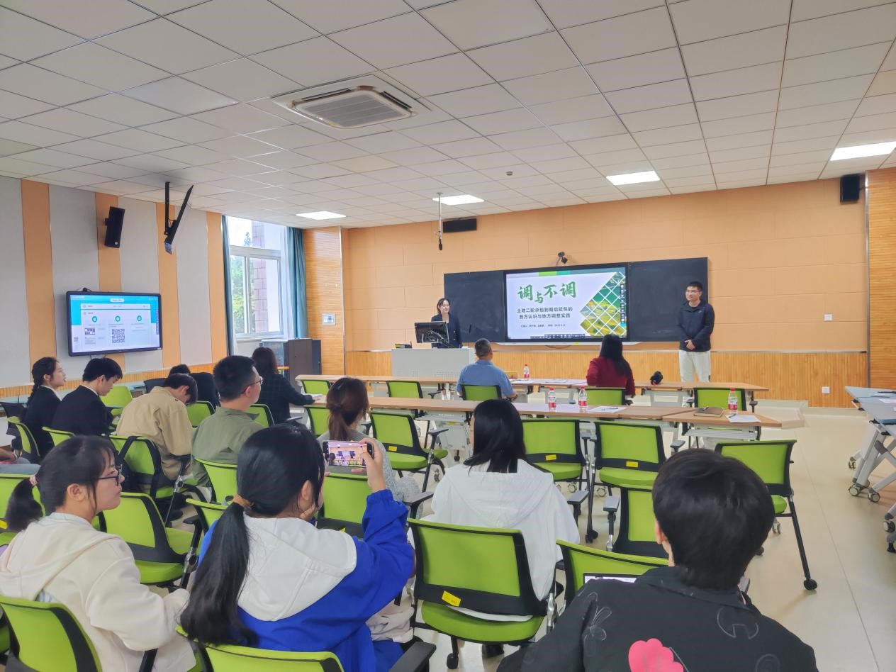 培训会现场氛围积极活跃,项目团队结合PPT,就项目发展现况进行现场答辩汇报。团队成员们根据土地延包的关键词,详细介绍了项目背景、研究方法及已有成果等。