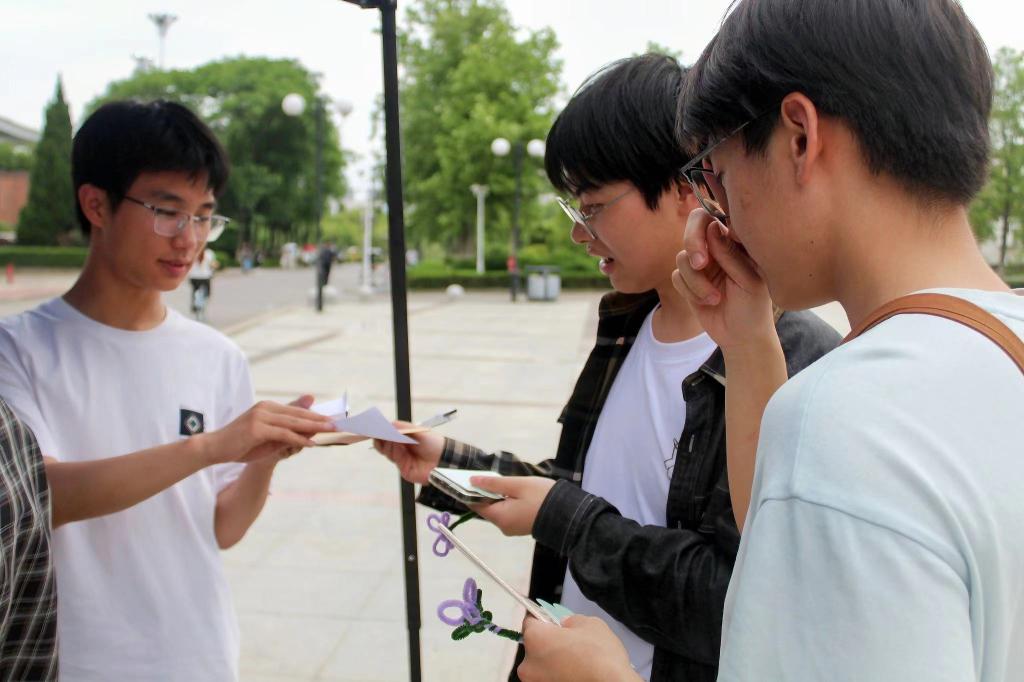 春夏交接日的午后,头顶洒下的阳光,熠熠生辉,温暖且明亮。同学们在西苑食堂门口开始集章活动。活动点的第一个任务是在便利贴上写下对未来的期许并贴在匿名表白墙上。在活动最后,表白墙上已经贴满同学们的憧憬与愿望。5月20日是个浪漫的日子,同学们也不忘为党献上专属告白。为此而设置的第二个任务点——党团知识竞答便引导同学们回顾了中国共产党带领中华民族站起来、富起来、强起来的伟大实践,回顾了中国共产党百年奋斗的光辉历程。