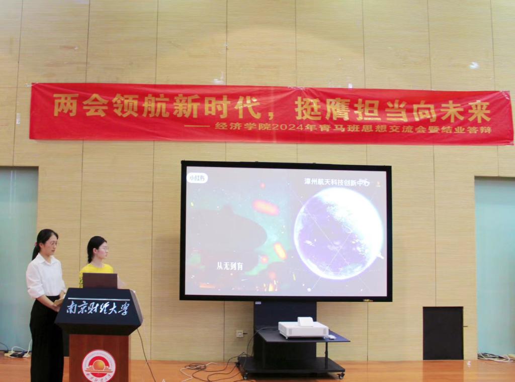 于图书馆四楼世界之窗开展“两会领航新时代,挺膺担当向未来”青马班思想交流会暨结业答辩。学院党委副书记贾亦璞老师,学工班主任梁少颖老师,团委书记潘怡老师,学生党员孙奕洋、徐晓宁担任答辩评委,本期青马班全体成员参加活动。
