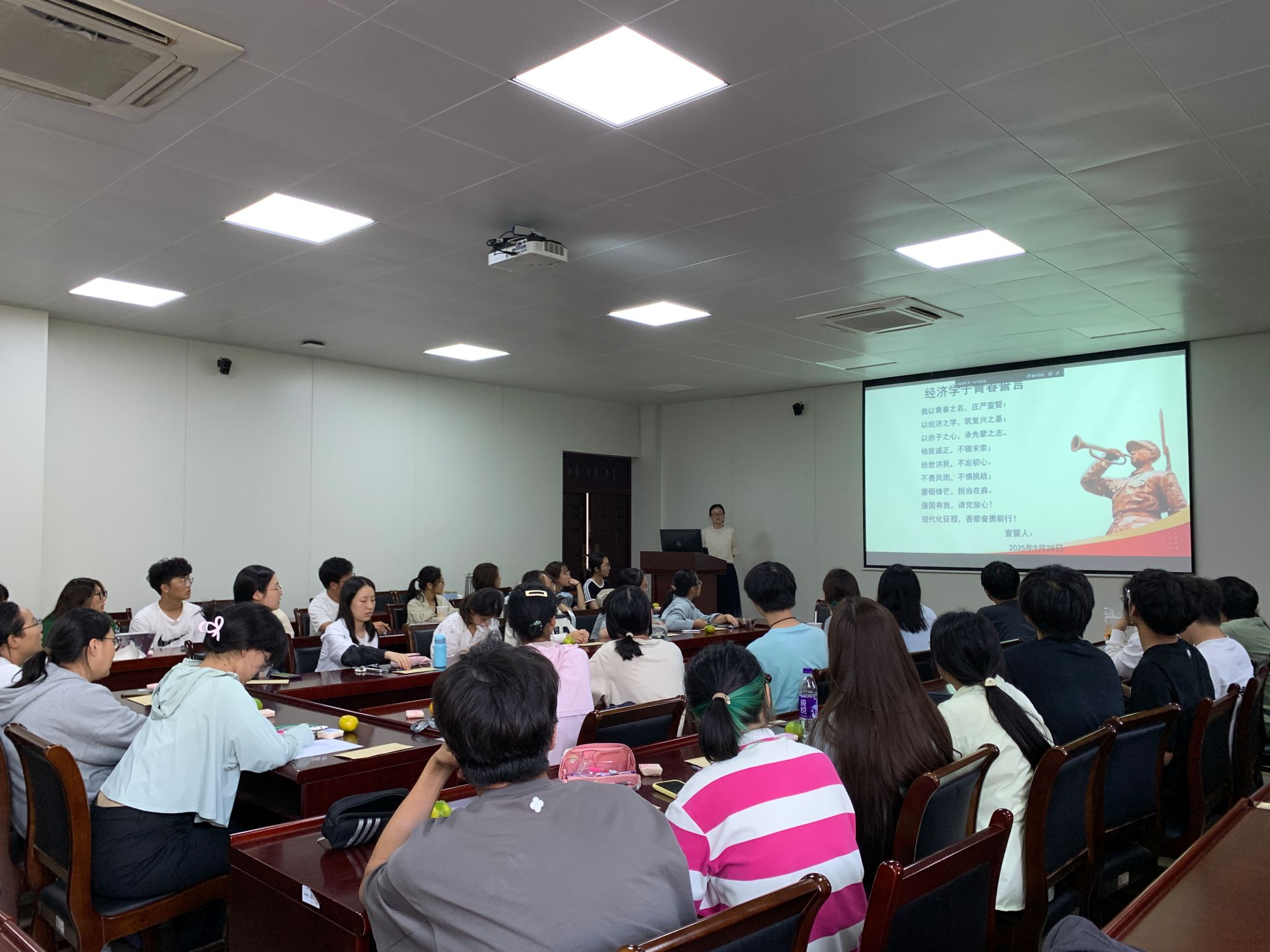 班会的最后篇章洋溢着庄严的仪式感。同学们在特制的“征程卡”上郑重写下大学四年的奋斗目标与承诺,用信封密封好,相约毕业之时共同启封检验。随后,在班长带领下,全体新生肃立宣誓:“以经济之学,筑复兴之基;以赤子之心,承先辈之志……强国有我,请党放心!”铿锵誓言在教室回荡,展现了经济学子不负时代、不负韶华的坚定决心。