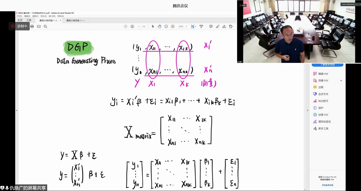 仇教授首先强调了线性模型中6个基本假定的重要性,并对其数学表达形式进行了严谨的理论推导。随后,仇教授对比了参数方程模型与非参数方程模型在不同等级的数据样本下,估计结果的差异,并提醒学员们,在如今的大数据时代,理论建模不应该局限于线性模型,要在数据分析的基础上选择合适的函数形式。紧接着,仇教授以数理推导与实际例子相结合的方式向学员们介绍了因果效应参数的数学表达式及其含义,使学员们对因果关系的理解也更加地形象化和具体化。最后,仇教授回答了学员们对于理论推导过程中的一些疑问,通过此次讲座的学习,学员们对计量经济学中的基本假设理论有了更深层次的理解。