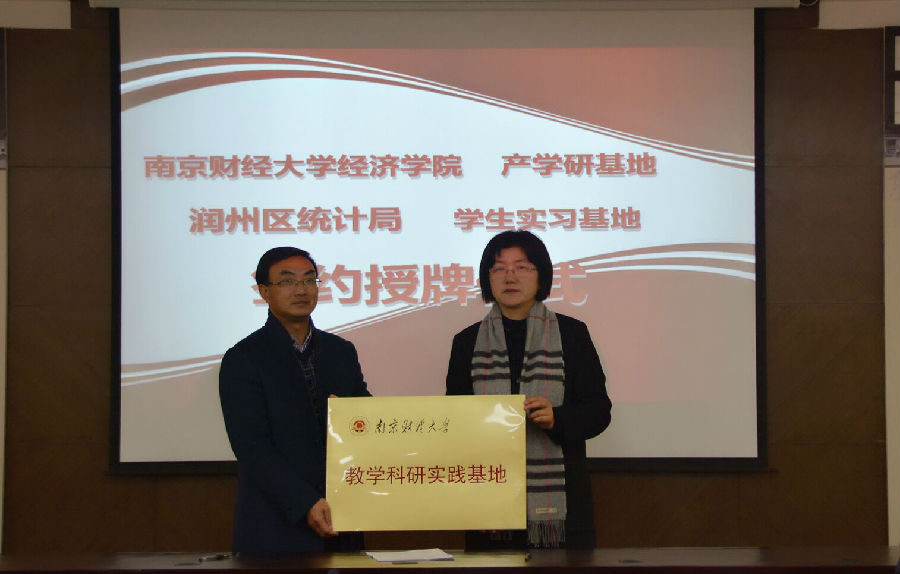 随后,润州统计局江金保局长与陈耀辉书记签署产学研基地协议、实践基地协议。邱伟芬副校长为润州区统计局“教学科研实践基地”授牌。