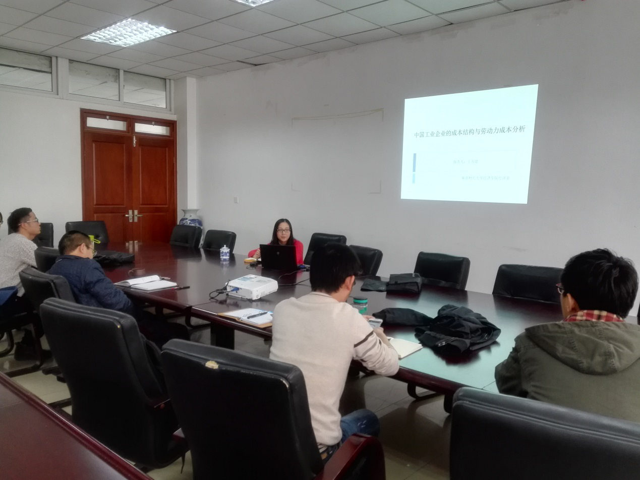 在经济学科楼307举办了长三角“收入分配与经济增长”学术论坛第十一次报告。报告题为《中国工业企业的成本结构与劳动力成本分析》,报告人为本院副教授王万珺博士。本院和财税学院部分老师参加了讨论。