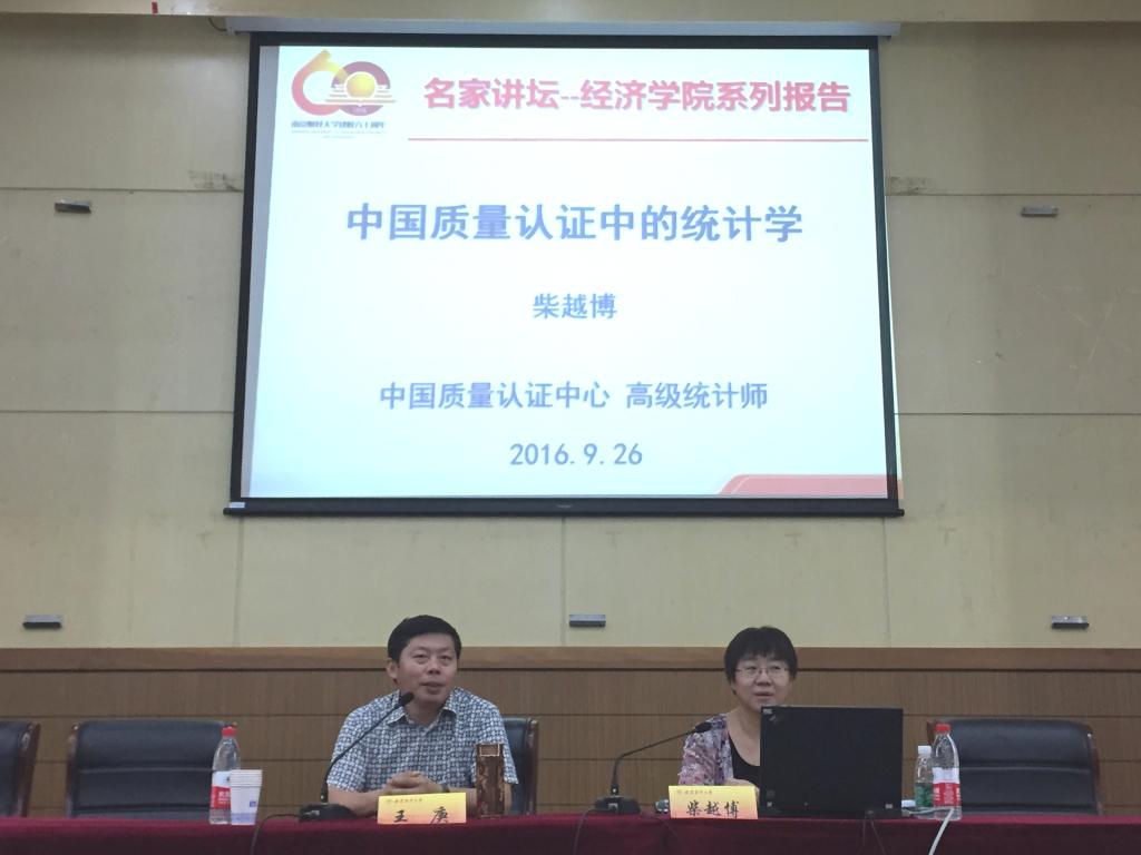 邀请,我校计划统计专业8201班校友、中国质量认证中心体系认证部部长、高级统计师柴越博在我校仙林校区管理学科楼报告厅作了题为“中国质量认证中的统计学”的讲座。讲座由江苏省教学名师王庚教授主持。学院部分教师、统计专业学生聆听了讲座。