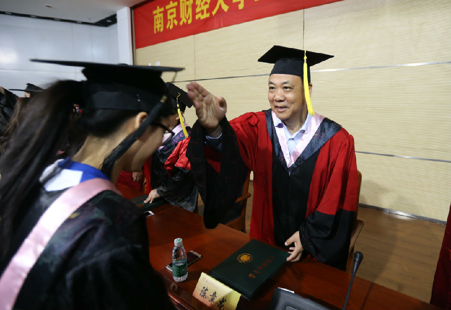 随后,叶林祥副院长宣读了《关于同意授予2016届本科毕业生左佳等3356位同学学士学位的决定》。毕业生们依次上台,与会领导和老师为毕业生颁发了学士学位证书、拨正流苏,并与同学们热情握手,表达祝愿。