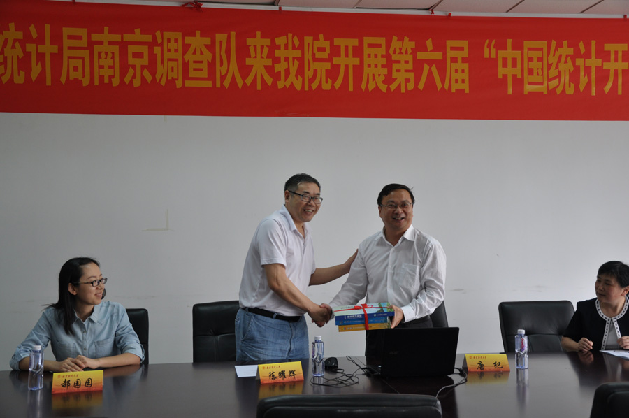 赠送了《2015年南京统计年鉴》、《第三次经济普查汇编》等统计图书。随后,唐纪副队长就当前大数据背景下统计调查的现状、挑战与机遇、变革与前景以及统计人的工作和多彩生活向现场师生进行了介绍;南京调查队的工作人员并向同学们介绍了日常的主要统计调查数据——城乡居民收入、农产量、CPI、PPI、PMI等。