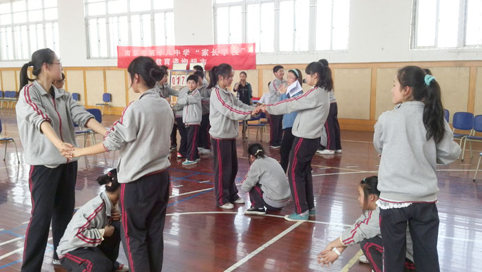 此次团辅活动分为松鼠抱大树、自生训练、呼吸调整、情绪表达、解心结等五个环节。活动伊始,在心理协会同学们的引导下,现场气氛迅速高涨,十八中的同学们踊跃参与到松鼠抱大树的游戏中,欢声笑语充满了现场。在自生训练与呼吸调整环节,在心理协会同学的指引下,伴随轻柔的音乐声,同学们在意念中体验到了精神的放松。随后是“情绪表达”环节,该环节调动了同学们的主动性,他们积极表达自己的梦想、愿望与烦恼,并由其他同学出谋划策提出解决办法;有的同学较腼腆,但在心理协会同学的鼓励下,大胆说出了自己梦想与烦恼,获得了同学们的赞许。最后一个环节是“解心结”,该环节让同学们意识到了团结互助的重要性,在小游戏中收获了大道理。
