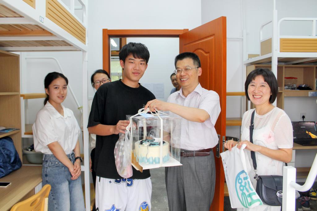 党委书记张圣兵、党委副书记贾亦璞、新生辅导员徐昊翔、学工班主任梁少颖、团委书记潘怡在报到日当天分别走进1号宿管站和4号宿管站学生公寓,和新生们近距离接触,与在报到当天过生日的两名新生共同庆生,分享成长的喜悦,送上真挚的祝福。