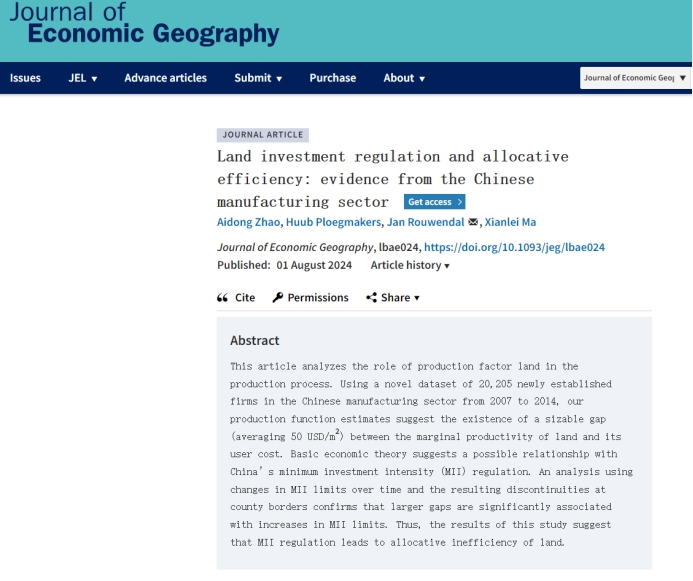 赵爱栋博士与荷兰阿姆斯特丹自由大学等学者的合作论文“Land investment regulation and allocative efficiency: Evidence from the Chinese manufacturing sector”被城市与区城经济学国际顶级期刊Journal of Economic Geography正式接受发表。成人色情
