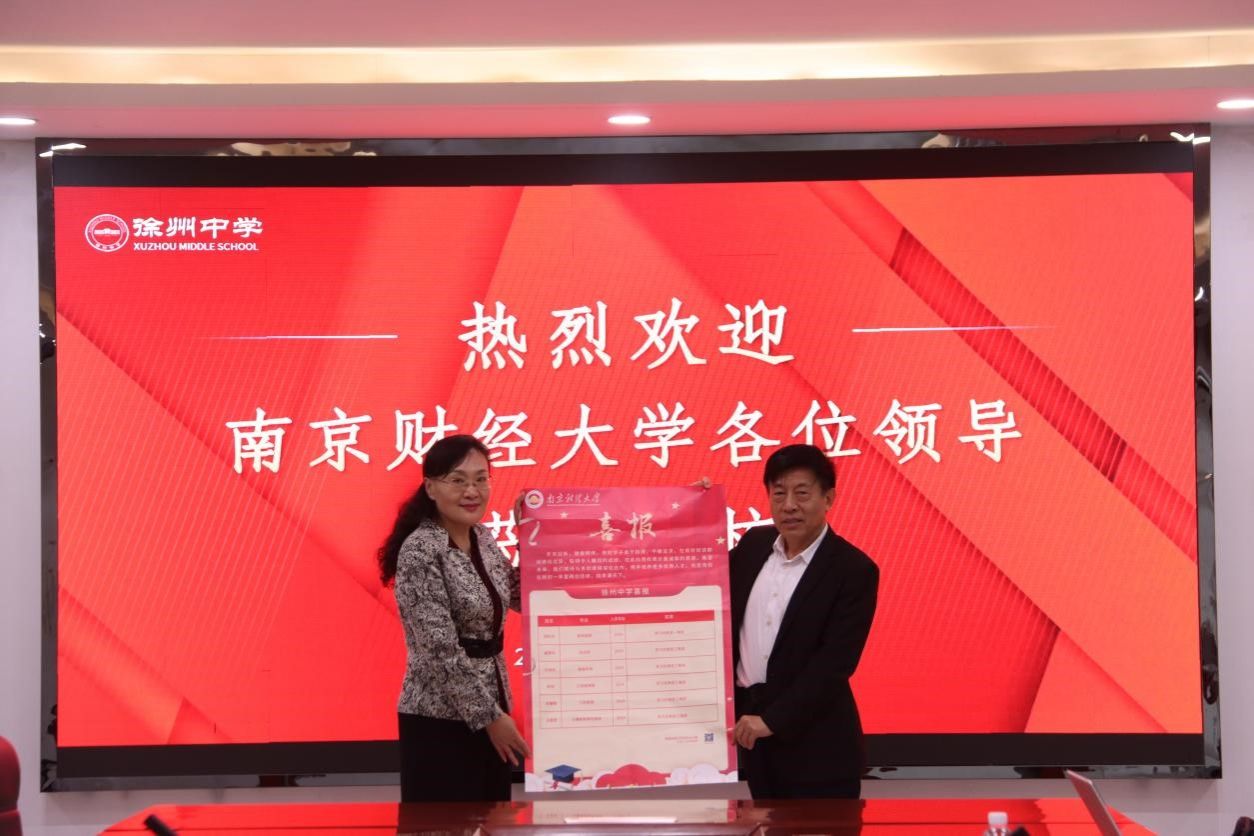 党委常委、党委组织部部长吕戎对徐州中学领导的热情接待表示了衷心的而感谢。吕戎部长表示,徐州中学教学质量优异,学生综合素质优秀。在2024年招录的9名徐州中学的大一新生中,就有6人获得学习优秀奖学金,这充分体现出徐州中学优秀的教学质量和育人理念。吕戎部长强调,双方应深化招生宣传合作,创新人才培养方式,探索协同发展路径,形成“中学打基础、大学促提升”的人才培养链条。最后,吕戎部长向张必忠校长赠送优质生源奖学金喜报。
