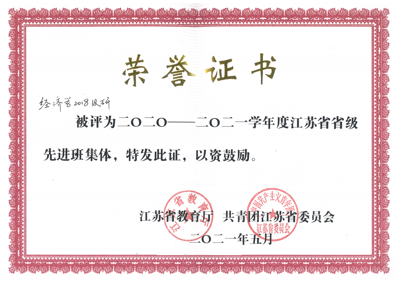 经济学2018级研获得“江苏省省级先进班集体”荣誉称号。
