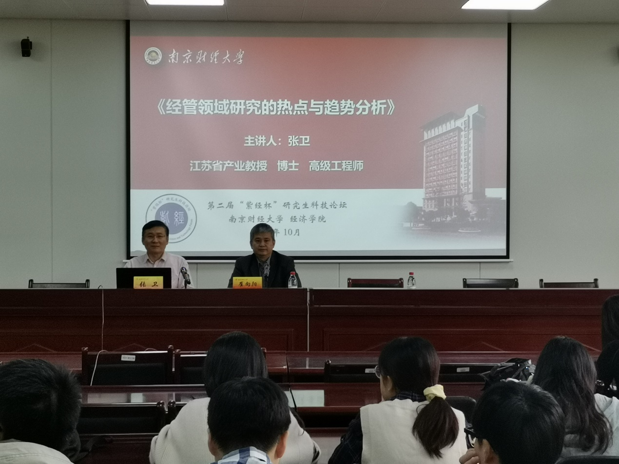 本次学术论文大赛决赛分为上半场和下半场。上半场由江苏省产业教授、敏捷创新经济管理研究院副院长张卫做题为《经管领域研究的热点与趋势分析》的主旨报告。张卫教授以“新时代数业经济在生活中的影响”提问开篇,提出数字技术促使二元空间加速向三元空间转变的思想,表明了人类社会已经身处大数据时代,从三个方面讲述了新科技革命的主导者所需要具备的新生产要素,指出21世纪新思维范式已经出现,并强调了数据在新时代思维发展的重要性。张卫还分享了敏捷智库使用大数据方法做出的学术研究成果,使用可视化方法展示了近期经管领域的研究热点。