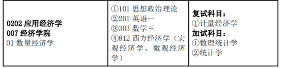 按照一级学科招生,硕士研究生招生学科(专业)共4个:理论经济学(学硕)、统计学(学硕)、应用经济学(数量经济学方向,学硕)、应用统计(专硕)。