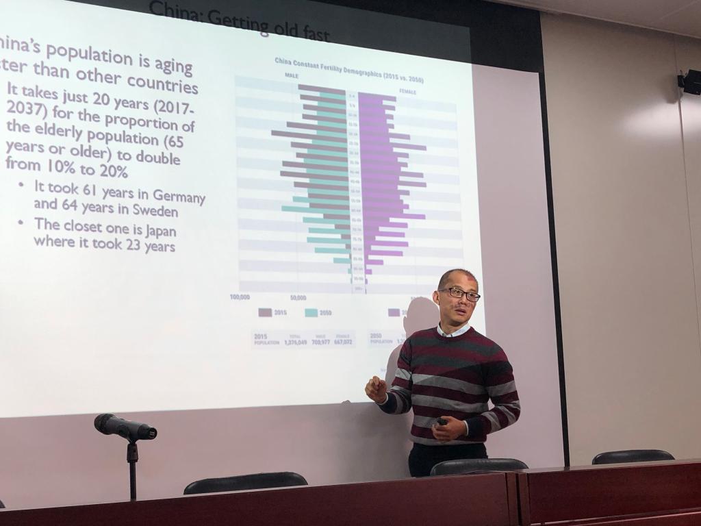 邓赵国荣教授从国际人口老龄化出发,分析了我国人口老龄化的问题并给出相关政策建议,同时也展望了未来人口问题的研究方向。他指出,中国作为世界上最大的发展中国家,人口老龄化问题不仅加重了社会负担,也使传统家庭面临赡养老人、照顾子女的双重挑战。因此,延长退休年龄、建立并完善社会保障体系、鼓励养老储蓄等都是我国应对老龄化问题的重要措施。邓赵国荣教授的报告见解独到,深入浅出,引发了在座同学的思考。