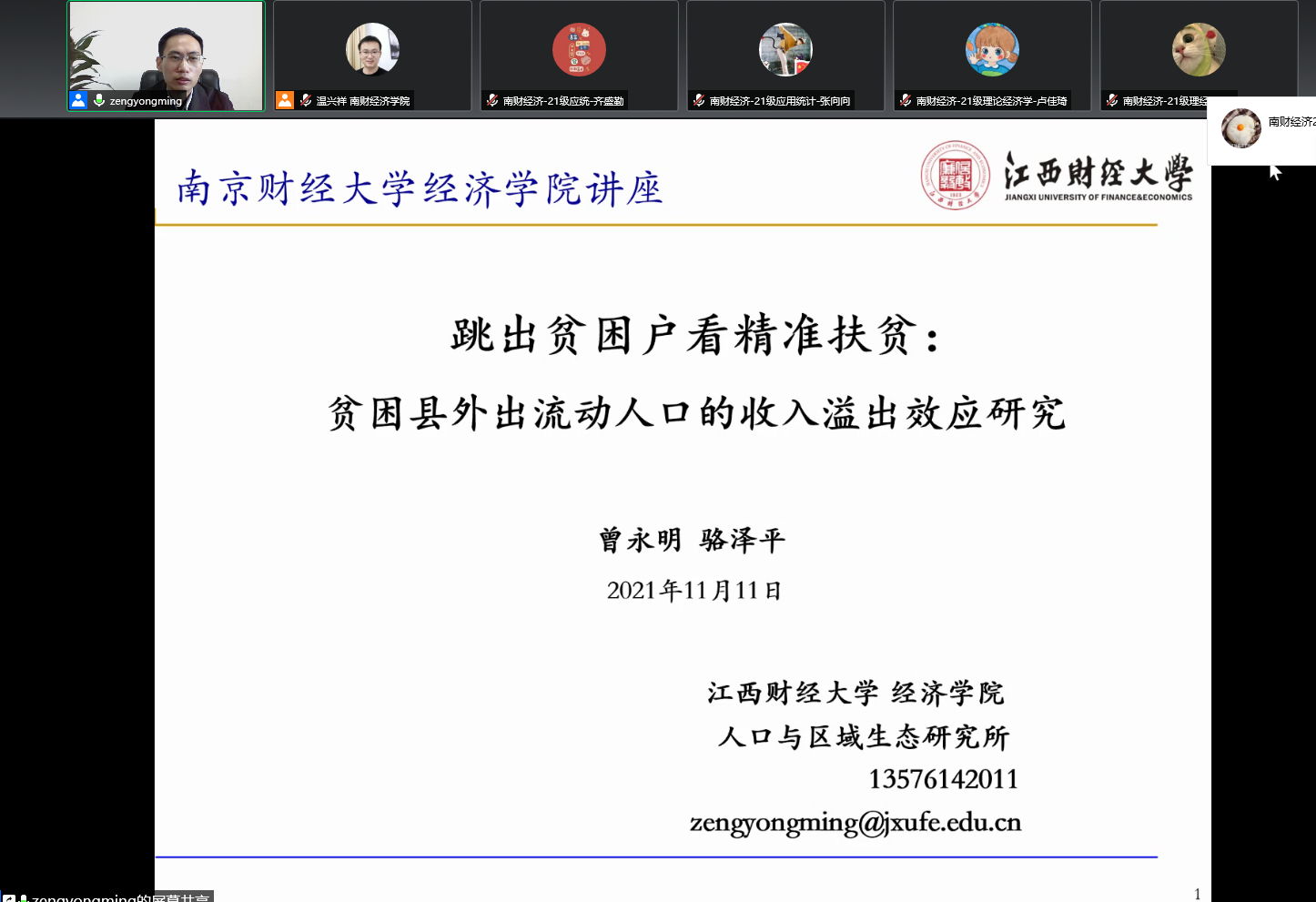 师生作了题为“跳出贫困户看精准扶贫:贫困县外出流动人口的收入溢出效应研究”的学术报告。报告由学院温兴祥老师主持,学院部分教师和研究生参与了此次讲座。