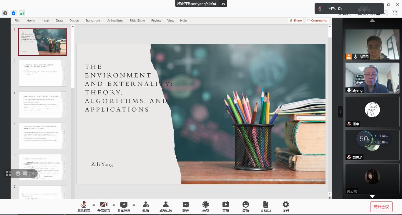 方国昌教授就多主体博弈机制的问题与杨教授展开了交流与讨论,杨教授也耐心回答了与会教师和研究生的提问。会议氛围良好,学习成效显著。