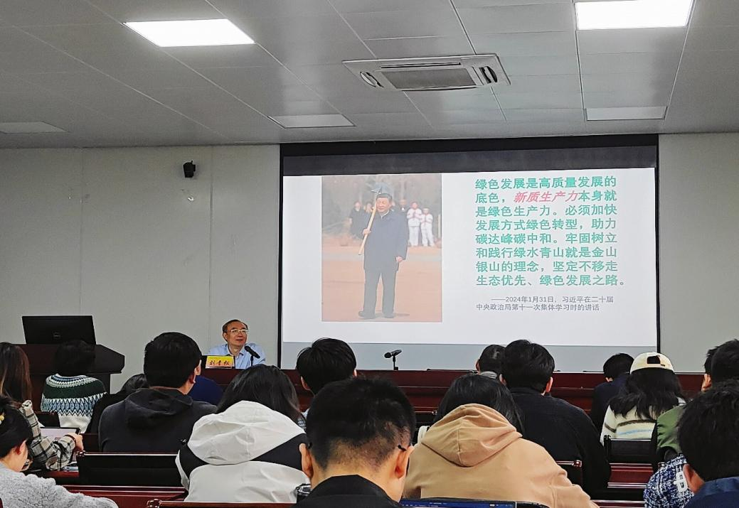聘任仪式后,刘青松教授作了题为“习近平生态文明思想深刻内涵”的学术报告。报告阐述了绿色发展是高质量发展的底色,新质生产力本身就是绿色生产力。必须加快发展方式绿色转型,助力碳达峰碳中和。牢固树立和践行绿水青山就是金山银山的理念,坚定不移走生态优先、绿色发展之路。结合自身的工作经历及在浙江湖州、江苏兴化等展开的多个调研案例,刘青松教授从根本保证、历史依据、基本原则、核心理念、宗旨要求、战略路径、系统观念、制度保障、社会力量以及全球倡议十个角度深度剖析习近平生态文明思想的“十个坚持”原则:坚持党对生态文明建设的全面领导、坚持生态兴则文明兴、坚持人与自然和谐共生、坚持绿水青山就是金山银山、坚持良好生态环境是最普惠的民生福祉、坚持绿色发展是发展观的深刻革命、坚持统筹山水林田湖草沙系统治理、坚持用最严格制度最严密法治保护生态环境、坚持把建设美丽中国转化为全体人民自觉行动、坚持共谋全球生态文明建设之路,详细注解习近平生态文明思想的深刻内涵。报告内容精彩生动,在座师生认真聆听,积极发言讨论,学术氛围浓烈。