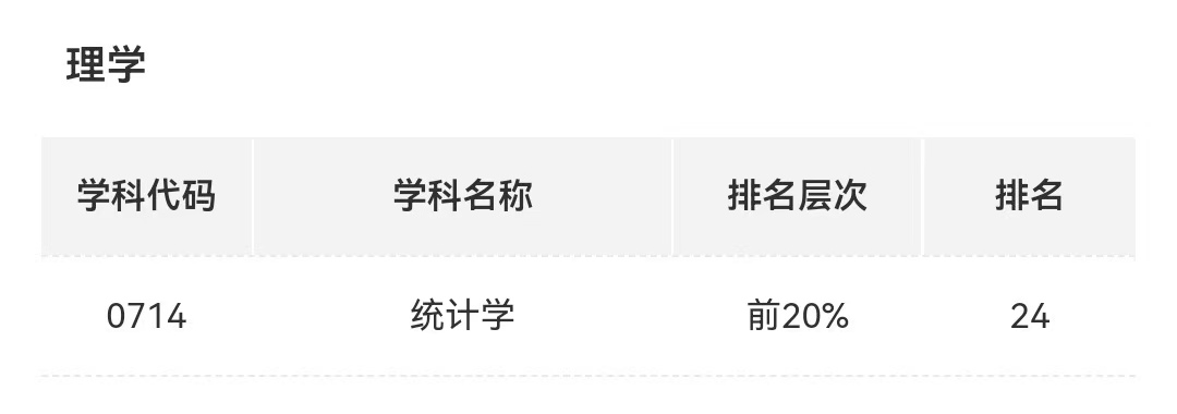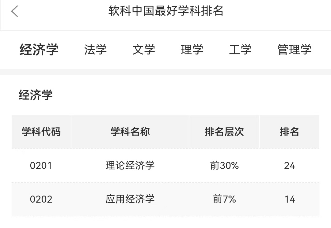 应用经济学、统计学、理论经济学三个学科全部上榜。其中,应用经济学排名位居全国第14名,前7%;统计学排名位居全国第24名,前20%;理论经济学排名位居全国第24名,前30%。